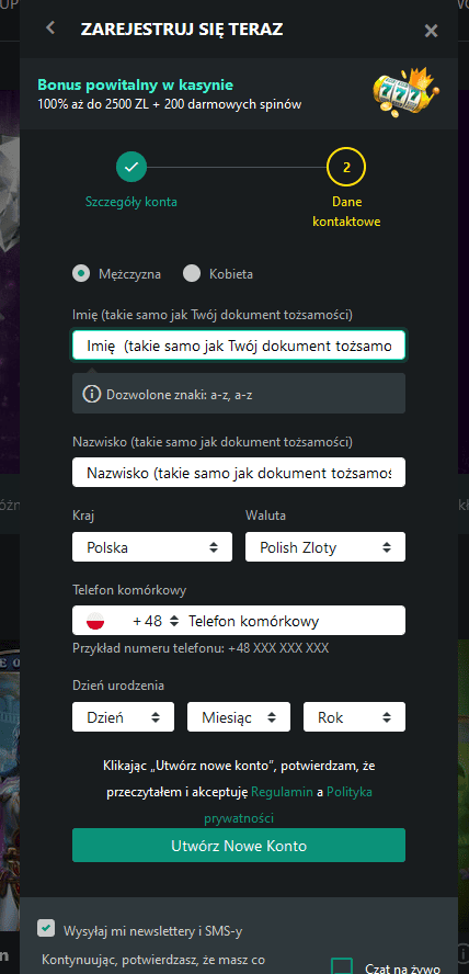 - Wpisz szczegółowe dane konta, w tym dane osobowe, telefon komórkowy i datę urodzenia. Możesz także opcjonalnie zaznaczyć zgodę na otrzymywanie newslettera i SMSów, co warto zrobić, bo zapewni ci to regularnie aktualizowane informacje o bonusach.