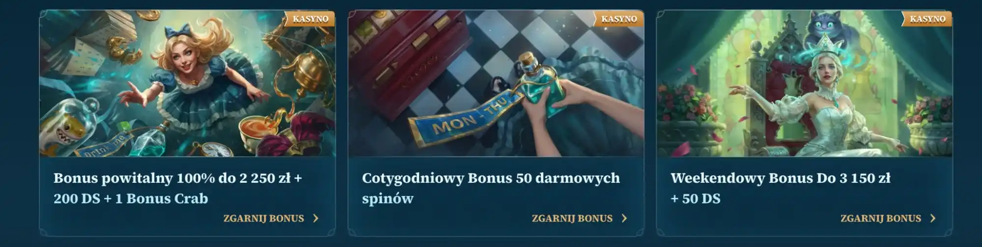 Oferta powitalna zapewnia 100% od pierwszej wpłaty do 2250 zł, a także 200 darmowych spinów rozłożonych na 10 dni i jedną darmową rundę w grze Bonus Crab. Aby zdobyć pełny bonus, należy wpłacić min. 90 zł – przy wpłacie od 45 zł otrzymamy tylko rundę w Bonus Crabie. Ofertę trzeba aktywować ręcznie w sekcji MOJE BONUSY.