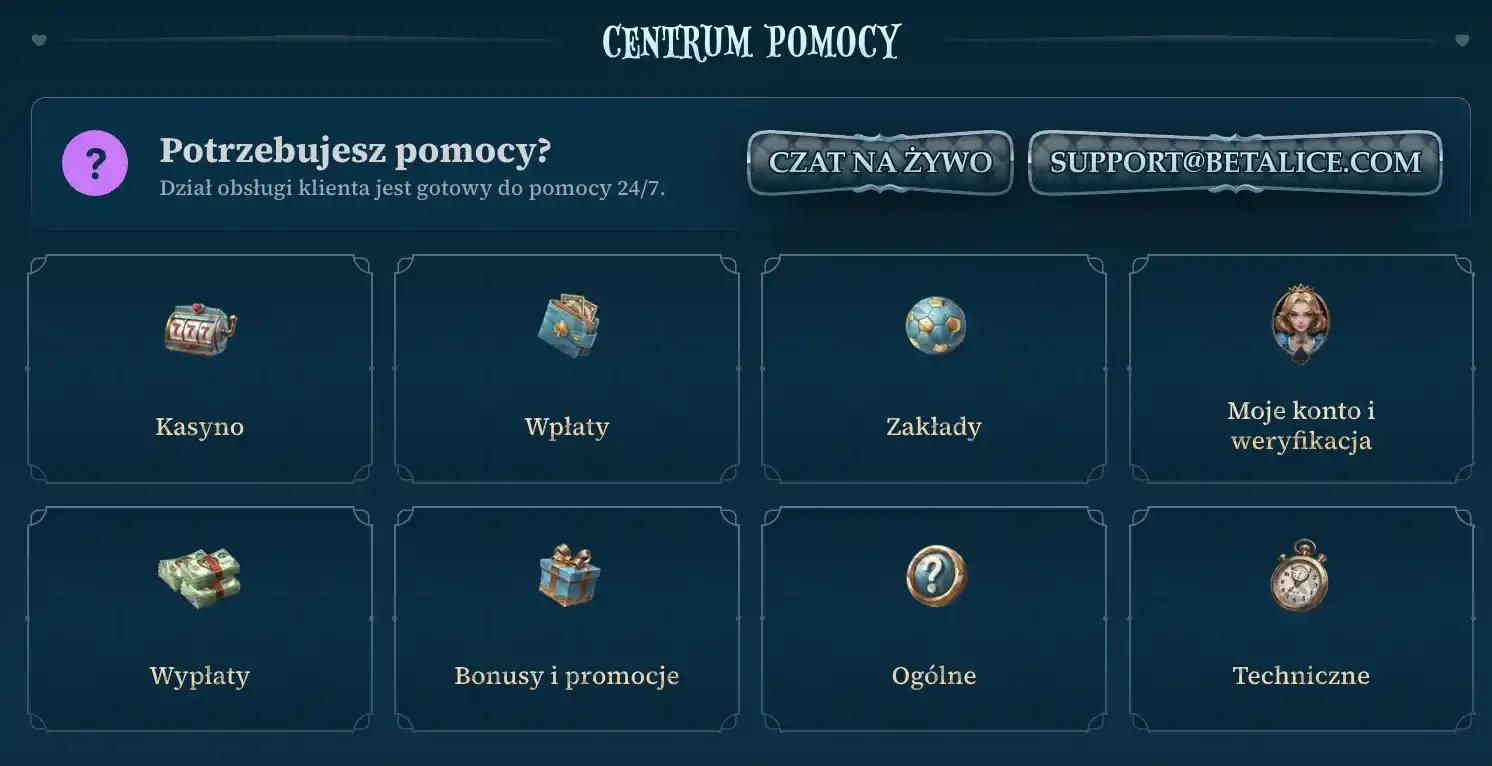 Obsługa klienta BetAlice Casino jest dostępna 24/7 – przez czat na żywo oraz mailowo pod adresem [email protected]. Do tego dochodzi rozbudowane centrum pomocy i sekcje FAQ w większości kluczowych podstron, co pozwala szybko znaleźć odpowiedzi bez kontaktu z konsultantem.