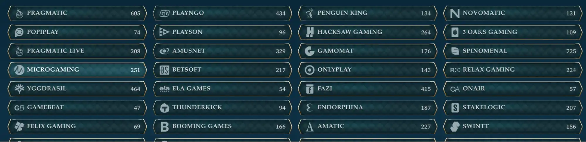 Gier do BetAlice Casino dostarcza ponad 105 studiów, co przekłada się na bardzo szeroką i zróżnicowaną bibliotekę gier. Trzon oferty stanowią najwięksi deweloperzy: Spinomenal (720+ tytułów), Pragmatic Play (600+) oraz Yggdrasil (400+). Obecni są też inni znani producenci jak Fazi, Novomatic i Playson. Ofertę uzupełniają mniejsze studia, m.in. Riddec Games i Automat Games. Minusem może być brak dwóch największych twórców na rynku – Evolution i NetEnt, co nieco ogranicza dostęp do części topowych gier live i najpopularniejszych slotów jak Starburst czy Gonzo’s Quest.