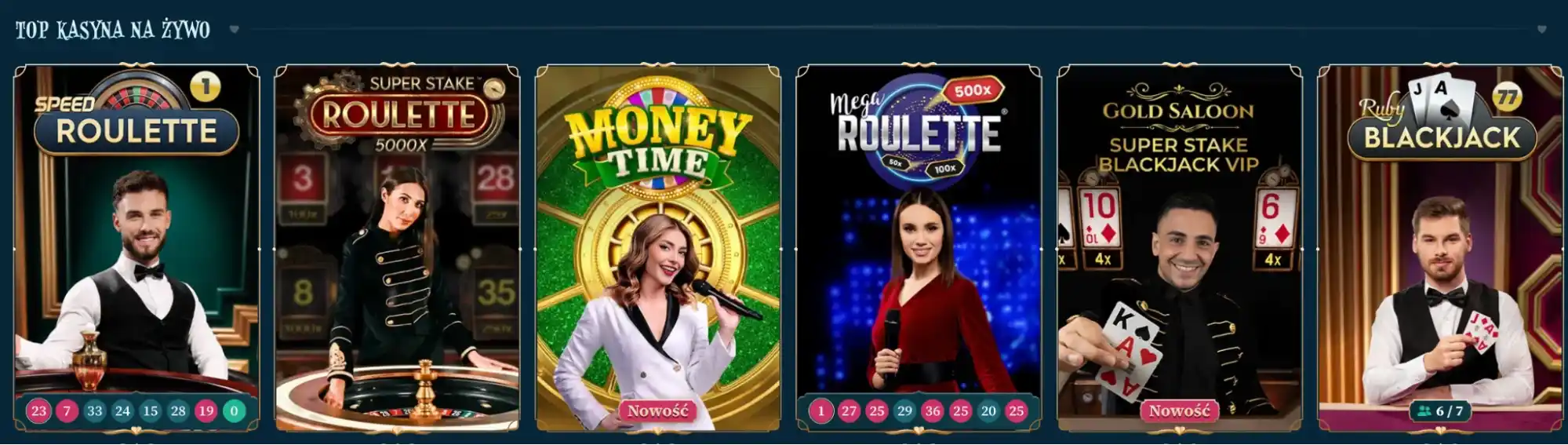 | Gry karciane i stołowe na żywo | Live Dealer | 445+ | Speed Baccarat, Gold Saloon Blackjack, Mega Roulette |