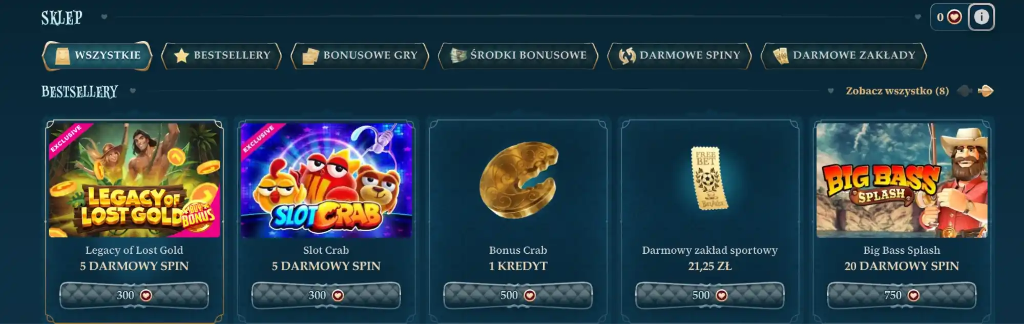 Monety można wymienić w wirtualnym sklepie na darmowe spiny, rundy w grze Bonus Crab lub bonusy pieniężne do 1275 zł. System jest przejrzysty i całkiem atrakcyjny, pozwala przełożyć regularną grę na wymierne korzyści. Dopełnieniem są liczniki czasu, co dodaje element dynamiki i zachęca do regularnego logowania.