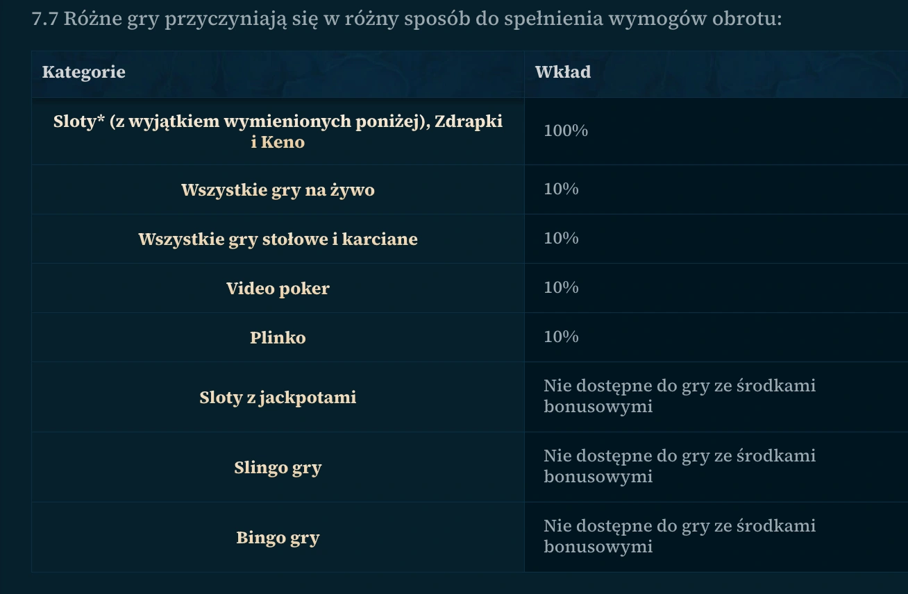 Lista gier wyłączonych znajduje się w punkcie 7.9 regulaminu, zaś w 7.10 przygotowana została lista ponad 1500 gier, w które w ogóle nie można grać z aktywnym bonusem. Wymogi są standardowe dla branży, choć lista gier zabronionych jest wyjątkowo długa, co wymaga czujności.