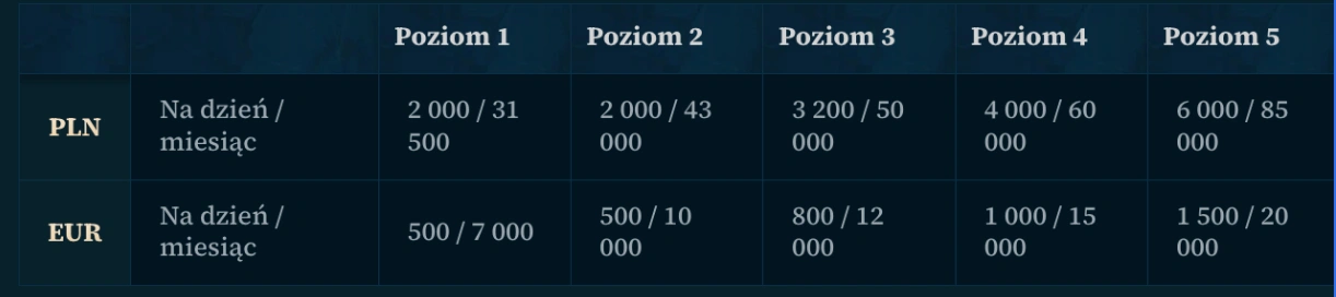 | Metoda płatności | Limit wpłaty | Limit wypłaty | Szybkość przetwarzania wypłaty | Opłaty |