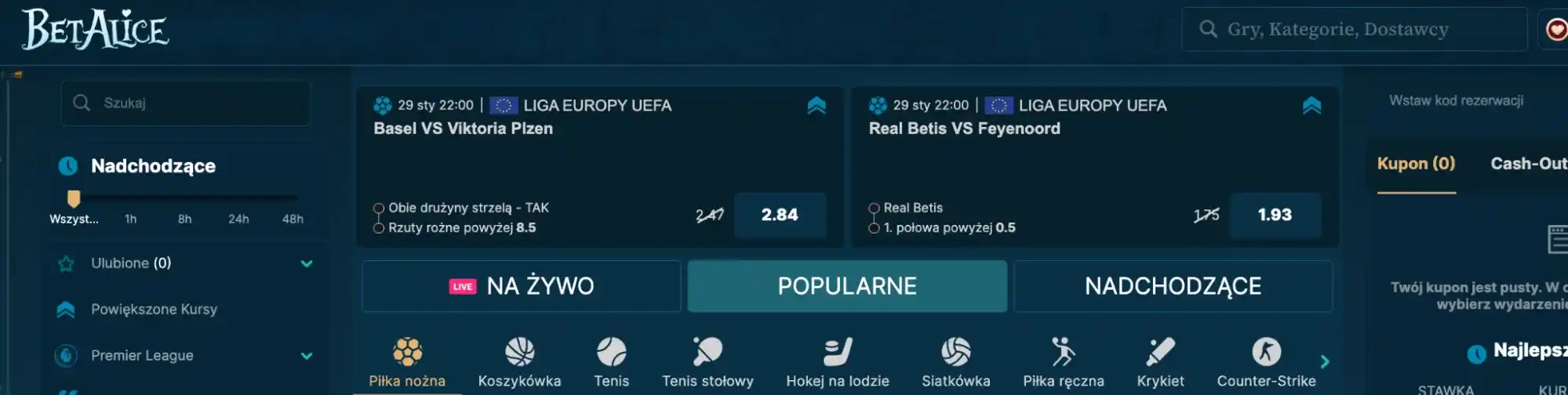BetAlice Kasyno Online udostępnia zakłady przedmeczowe i na żywo na ponad 25 dyscyplin sportowych. Najszerszą ofertę wydarzeń ma piłka nożna, koszykówka, tenis i hokej na lodzie. Stawiać można zarówno topowe rozgrywki, jak np. Premier League czy Serie A, jak i niższe ligi. Dostępne są też zakłady na e-sport, w tym CS2, Dota 2 i League of Legends, oraz sporty wirtualne od Kiron Interactive.