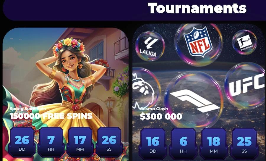 Oferta turniejowa jest skromna. Tak naprawdę dostępny jest jeden główny tematyczny turniej kasynowy, który trwa przez cały miesiąc. Zapewnia dzienne i tygodniowe nagrody. Pulę nagród stanowią darmowe spiny – do 150 000 FS. Turniej nie wymaga zapisów, wystarczy po prostu grać. Liczą się wszystkie zakłady postawione w grach w sekcji „Casino” i „Mini Games”. Zainteresowanie ze strony graczy jest ogromne, dlatego przy małym bankrollu trudno jest znaleźć się w czołówce rankingu. Jeśli chodzi o turnieje dostawców, na platformie nie ma żadnego.