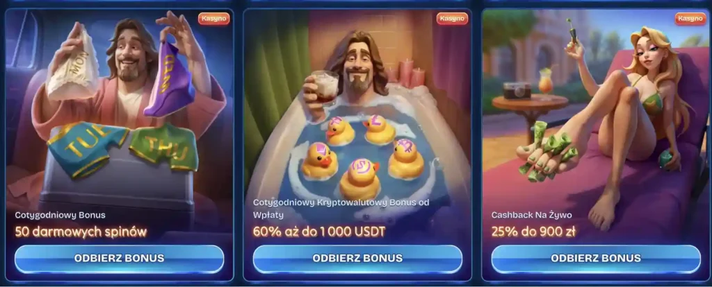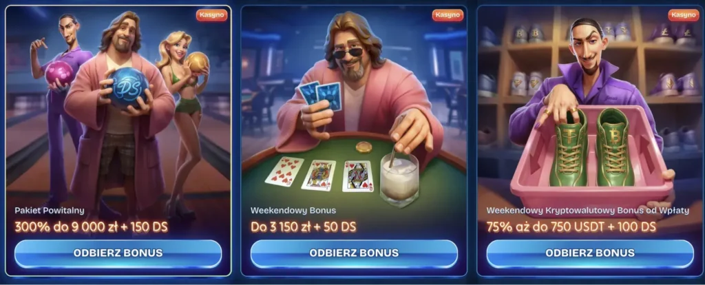 DudeSpin oferuje rozbudowany pakiet powitalny, regularne bonusy reload, kryptowalutowe promocje oraz atrakcyjne cashbacki dla VIP-ów. Poniżej szczegóły.