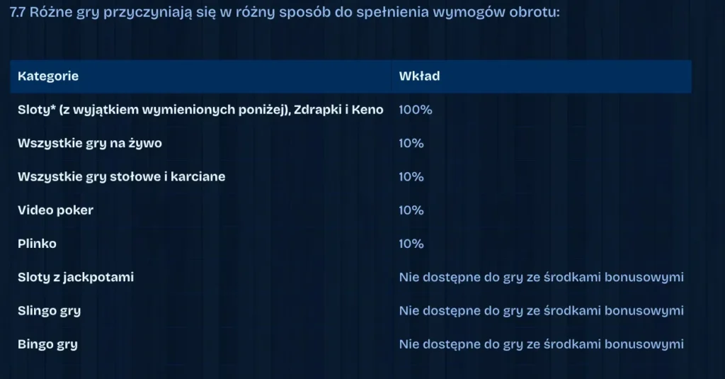 - sloty (z wyłączeniem tytułów w punkcie 7.9 i 7.10 regulaminu), zdrapki i keno – 100%;
