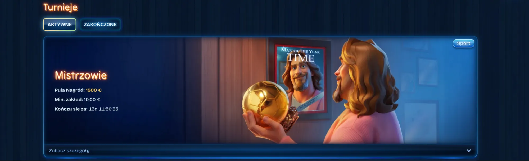 W trakcie naszych testów nie było klasycznych turniejów kasynowych. Zamiast tego DudeSpin Casino oferuje dynamiczne turnieje Spin Rally – szybkie wyścigi na slotach odbywające się non-stop i trwające 15 minut, z 5-minutowymi przerwami. Aby dołączyć, wystarczy kliknąć „DOŁĄCZ” i grać ze stawką min. 1,70 zł.