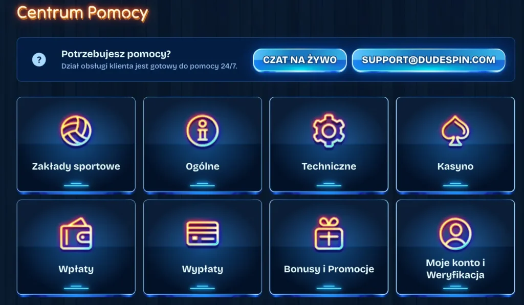 DudeSpin Casino udostępnia kompleksowe centrum pomocy z 8 sekcjami FAQ, które jest naprawdę pomocne i faktycznie pozwala rozwiązać wiele kwestii bez konieczności kontaktu z supportem. Jednak w razie czego obsługa jest dostępna 24/7 przez czat na żywo oraz kontakt mailowy pod adresem [email protected].
