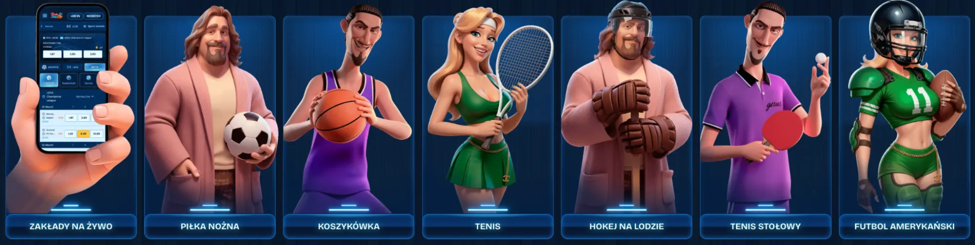 Platforma udostępnia sekcję bukmacherską z zakładami przedmeczowymi i live na ponad 25 klasycznych dyscyplin, w tym piłkę nożną, koszykówkę, tenis, hokej na lodzie i wiele innych popularnych i niszowych sportów. Nie brakuje też opcji na e-sport, na czele z grami takimi jak Counter-Strike 2, Valorant i League of Legends. Dostępne są też zakłady wyścigi konne i sporty wirtualne od firmy Kiron Interactive. Platforma zapewnia statystyki live i wybrane transmisje na żywo. Dla typerów przygotowano liczne promocje, w tym bonus powitalny 100% do 450 zł, reloady, cashback 10%, doładowania AKO i Bet Builder.