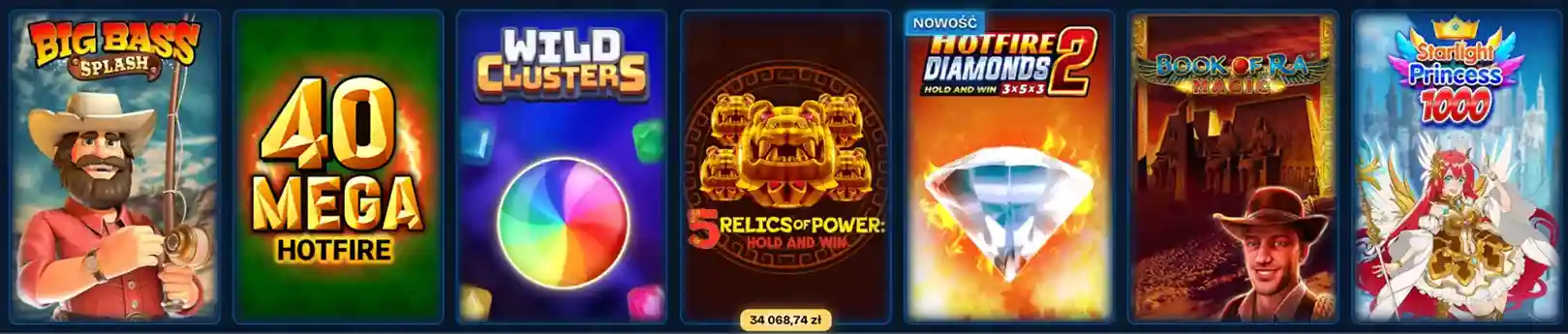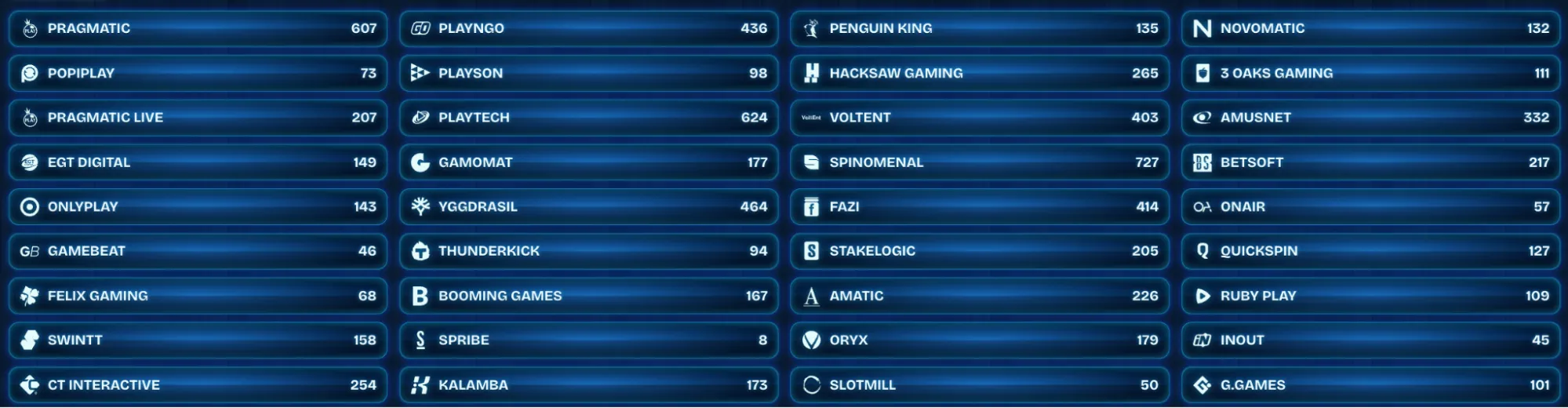 Kasyno jest zasilane przez ponad 100 certyfikowanych dostawców, co przekłada się na ogromną różnorodność tytułów. Mamy tu zarówno sprawdzone, topowe marki, jak Spinomenal, Betsoft, Playson czy Play’n GO, jak i nowoczesne studia, jak np. OnAir, Spribe, Iron Dog Studio czy Ruby Play. Jest więc fajna mieszanka nowoczesnych slotów, gier stołowych, gier live oraz dynamicznych gier crash i arkadowych.