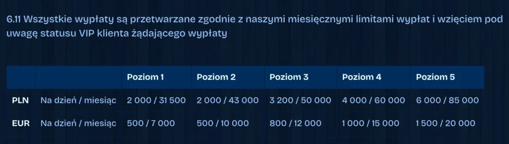| Metoda płatności | Limit wpłaty | Limit wypłaty | Szybkość przetwarzania wypłaty | Opłaty |