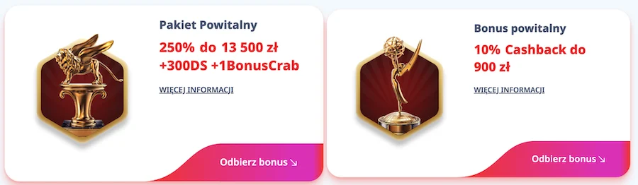 Wartość całego pakietu powitalnego to 250% do 13 500 zł + 300 FS + 1 Bonus Crab: