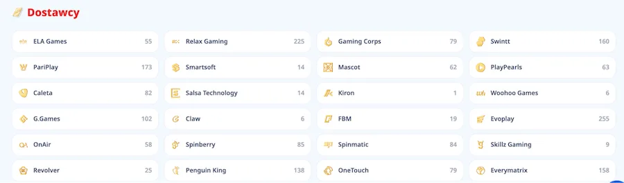 Na liście dostawców w Casino Infinity znajduje się 120 firm, co gwarantuje bardzo szeroki wybór tytułów z różnych kategorii. Dostępne są gry od topowych marek, takich jak Relax Gaming, G.Games, Swintt, Penguin King, Pragmatic Play, Red Tiger, Spinomenal, 3 Oaks Gaming czy Stakelogic. Tym samym w ofercie znajdziemy specjalistów w zasadzie w każdej dziedzinie – są czołowi producenci slotów, gier stołowych, gier na żywo i tytułów instant. Pewnym zaskoczeniem jest natomiast brak Evolution, które zwykle dominuje w kasynach na żywo.