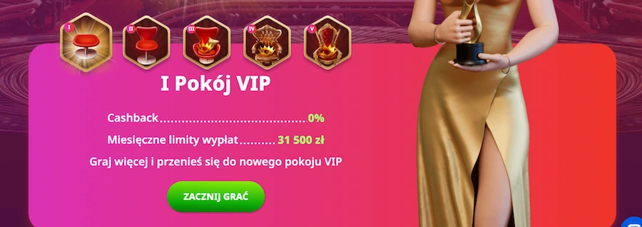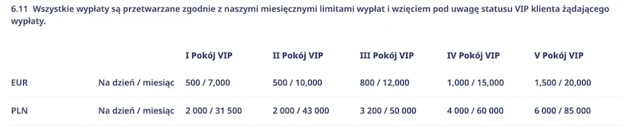 Mamy 5 poziomów, które zwane są tutaj „Pokojami VIP”. Startując od I Pokoju VIP nie mamy dostępu do żadnych benefitów. Cashback jest niedostępny, a miesięczny limit wypłat jest standardowy, wynosi 31 500 zł. Na kolejnym poziomie również nie mamy cashbacku, ale za to limit miesięczny wzrasta – do 43 000 zł. Dopiero od poziomu III Pokój VIP kwalifikujemy się do 5-procentowego zwrotu, a kolejne dwa poziomy to odpowiednio 10% i 15%. Od trzeciego poziomu wraz z miesięcznym limitem wzrasta też dzienny limit wypłat, do 6000 / 85 000 zł na ostatnim poziomie.