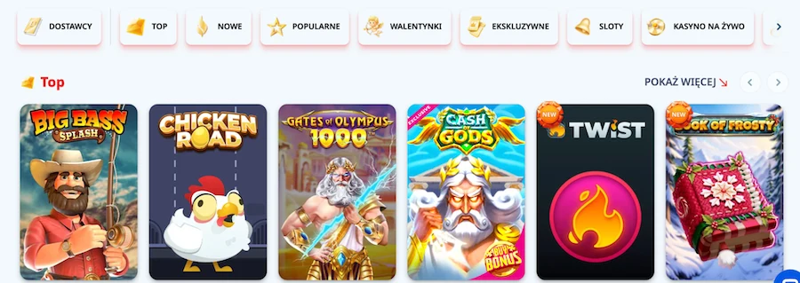 Dostępne są dwie oddzielne sekcje dla kasyna RNG i kasyna na żywo. Kategoryzacja jest solidna, są takie zakładki jak Popularne – gdzie wyświetlane są najchętniej ogrywane tytuły przez Polaków, czy Jackpoty – gdzie znajdziesz gry ze stałymi i progresywnymi jackpotami. Kategorie są dynamiczne, co jakiś czas pojawiają się nowe kategorie tematyczne związane np. ze świętami.