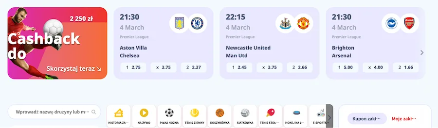 Platforma oferuje funkcję cash-out, wyszukiwarkę i zmianę formatu kursów. Łącznie możesz skorzystać z 8 dedykowanych promocji, w tym bonusu startowego do 450 zł, 10% cashbacku do 2250 zł oraz regularnych doładowań.