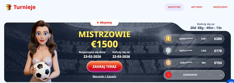 Infinity Kasyno przygotowało serię autorskich turniejów, które odbywają się cyklicznie – trwają tydzień lub miesiąc. Mamy trzy główne wydarzenia – Gold Saloon Live, Sloty Tygodnia i Wyścig Miesiąca, w których pule nagród stanowią Monety. Aby wziąć udział w rozgrywkach, należy zdeponować co najmniej 90 zł i grać w gry turniejowe, które różnią się w zależności od wydarzenia.