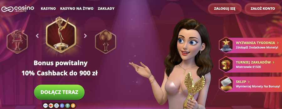 Każdy gracz Online Casino Infinity w poniedziałek może odebrać 25% zwrotu od przegranych w kasynie na żywo z zeszłego tygodnia, do maksymalnie 900 zł. Po zwrot należy zgłosić się do obsługi klienta. Minimalny cashback to 25 zł. Wymagany jest jednokrotny obrót.