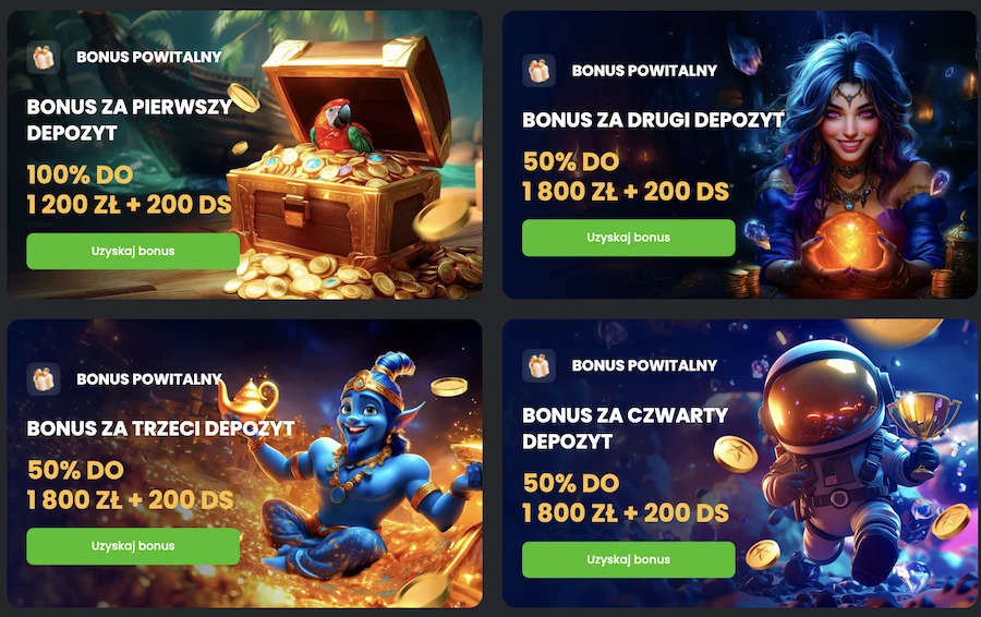 | Pierwszy bonus (100%) | do 200 zł + 30 FS | do 700 zł + 80 FS | do 1200 zł + 200 FS | NEWIN |