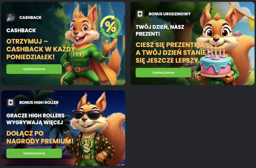 W kasynie czeka kilka fajnych korzyści. Mamy solidnie wyglądający na papierze pakiet powitalny, codzienne bonusy-niespodzianki, cotygodniowy cashback i bonus urodzinowy w ramach programu lojalnościowego oraz dedykowany bonus dla „grubych ryb”. Poniżej szczegóły.