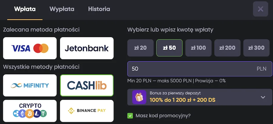 W zakresie płatności polscy gracze mają do dyspozycji karty płatnicze, Jetobank, e-portfel MiFinity, voucher CASHlib, Binance Pay i 12 kryptowalut, w tym USDT, LTC i ETH. Płatności krypto są bezpośrednio z portfela na portfel, nie ma opcji kupna kryptowalut na stronie kasyna. Minimalny depozyt wynosi 20 zł. Poniżej szczegółowy opis limitów dla każdej opcji.
