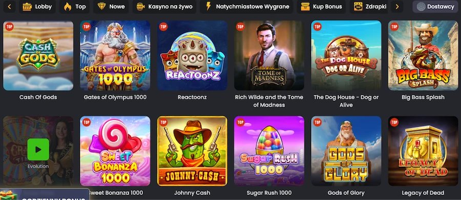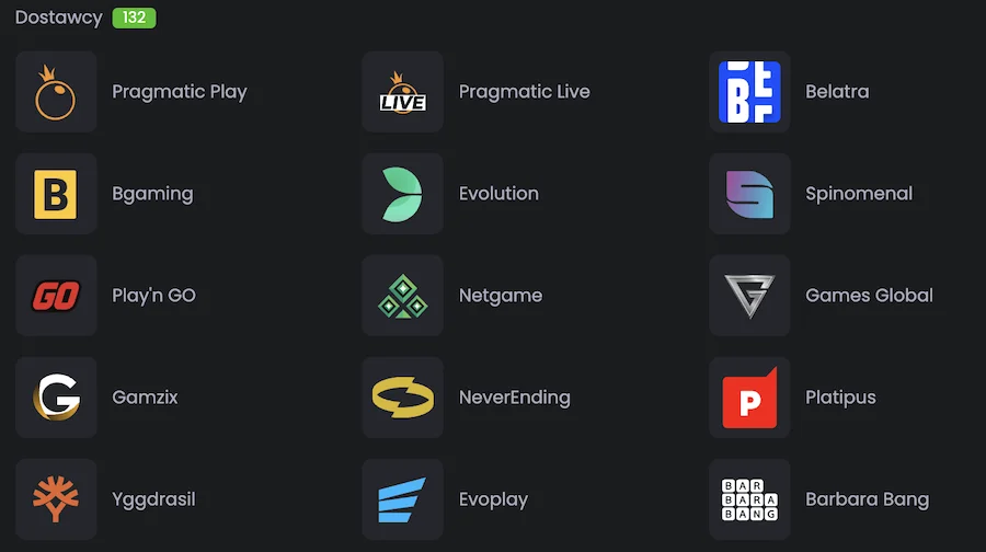 Serwis plasuje się w czołówce branży kasyn online, jeśli chodzi o liczbę dostawców – mamy tu gry od aż 136 deweloperów, naprawdę trudno jest wskazać platformę, na której znajdziemy ich więcej. Są w zasadzie wszystkie kluczowe firmy, w tym Pragmatic Play, BGaming, Evolution, Spinomenal, Play’n GO, Netgame, Yggdrasil, Evoplay i InOut, co zapewnia potężny wybór gier w każdym segmencie. W ofercie znajdziemy też nowe studia, np. F*Bastards, Champion, Playzia i RevDev, które wnoszą świeże tytuły i innowacyjne mechaniki.