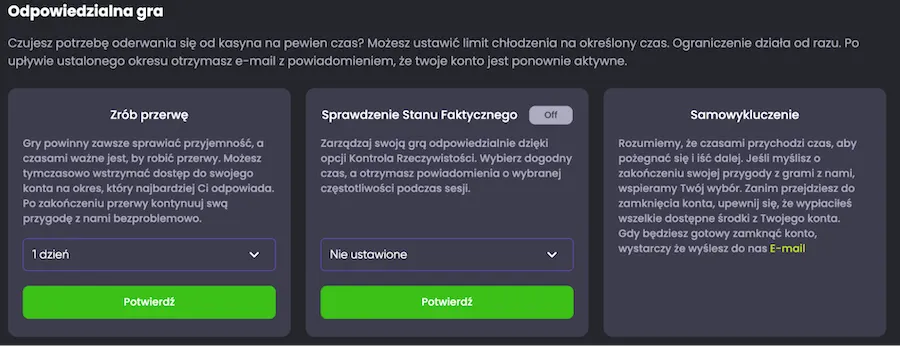 Pod względem odpowiedzialnej gry kasyno wypada bardzo dobrze. W ustawieniach konta (Moje konto -> Ustawienia) możesz aktywować przerwę od gry na 1 dzień, tydzień lub miesiąc, a także skonfigurować Kontrolę Rzeczywistości – przypomnienia co 60, 90 lub 180 minut. Jeśli potrzebujesz większej przerwy, dostępne jest samowykluczenie, które wymaga kontaktu mailowego z supportem.