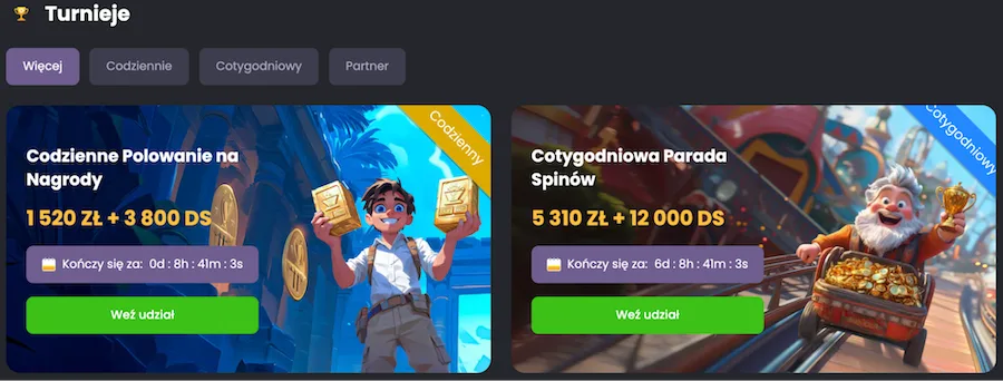 Dodatkowo dostępne są turnieje partnerskie od dostawców. Podczas naszych testów aktywne były takie wydarzenia jak Spin Express (Gamzix) i Golden Horizon Network Tournament (Barbara Bang).